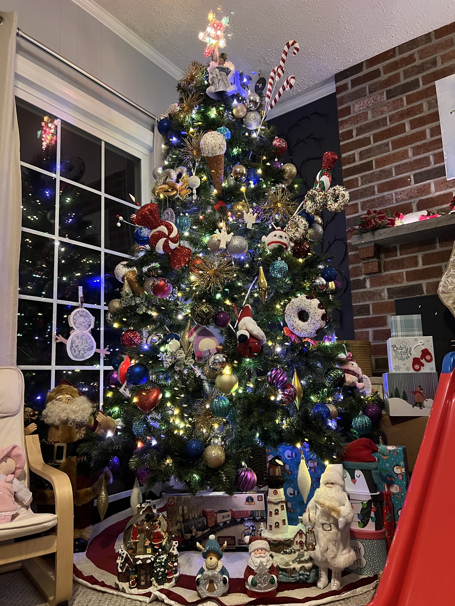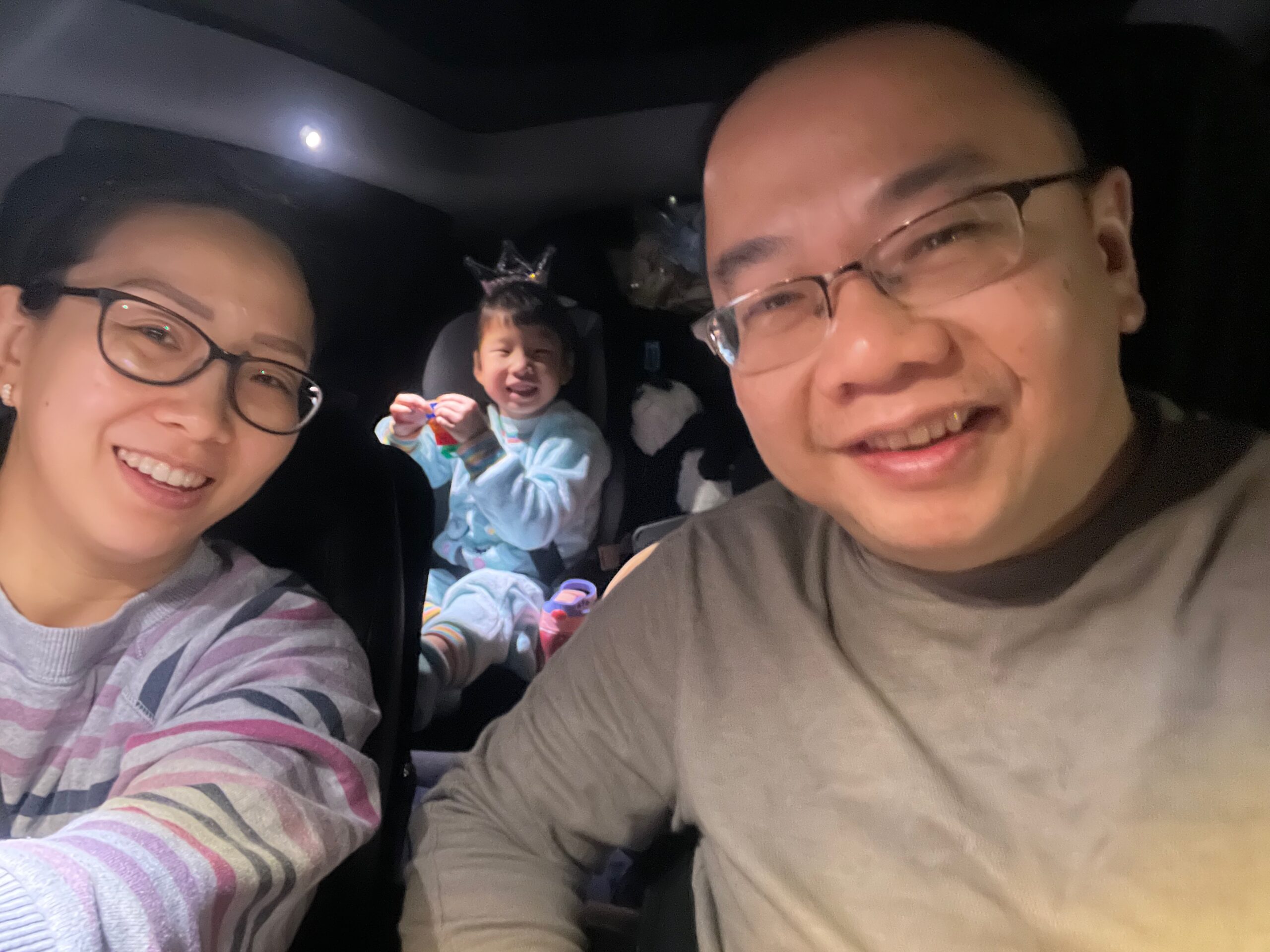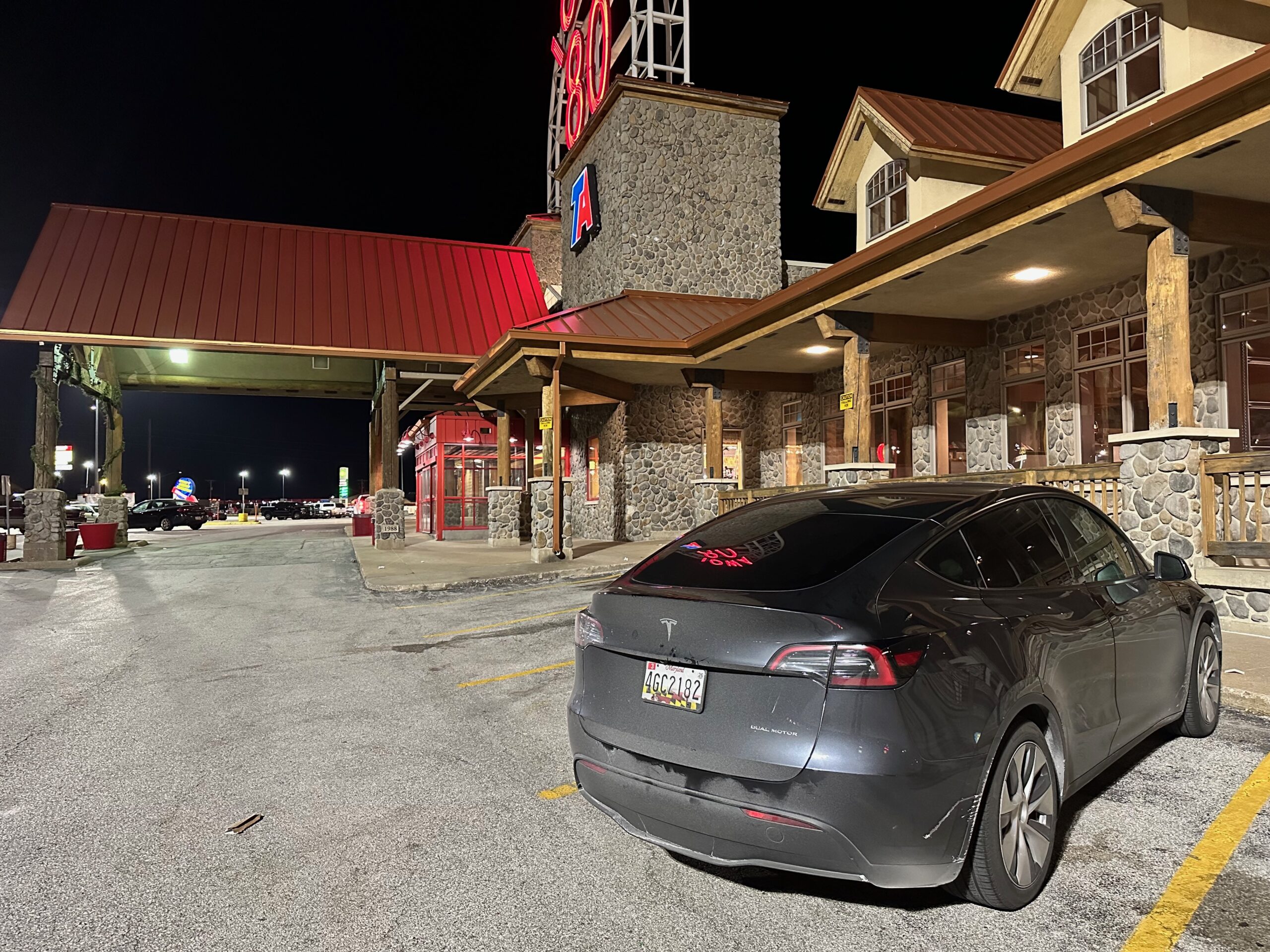Just like last year, we began our journey under the cover of night, aiming to reach our first destination right when it opened. We said goodbye to our Christmas tree and packed our Model Y as well as we could. It may have looked like a mess, but we brought a lot of stuff. Snow started to fall during one of our supercharger stops. Our excitement grew as we approached our first stop, the iconic Superdawg in Chicago.