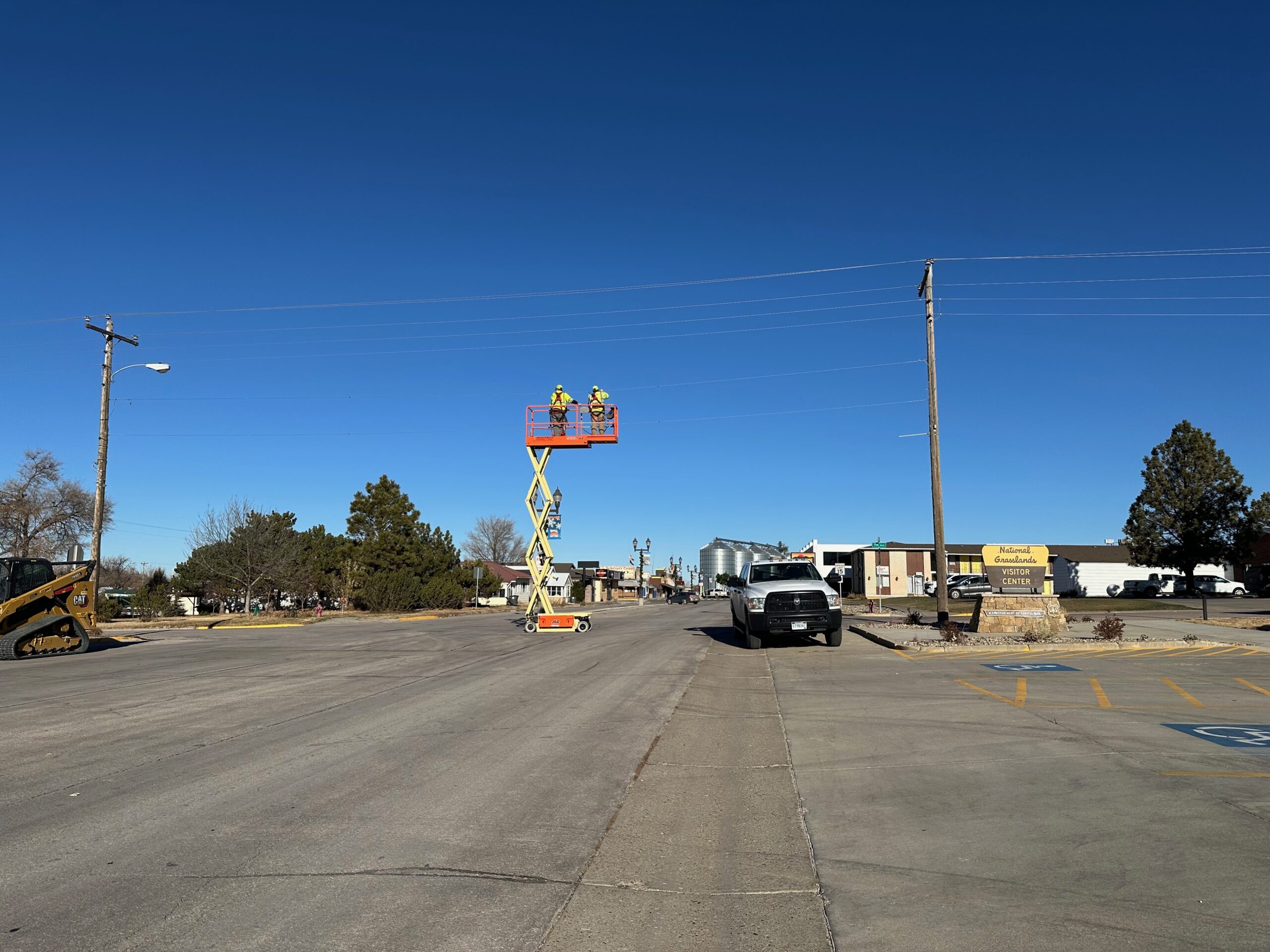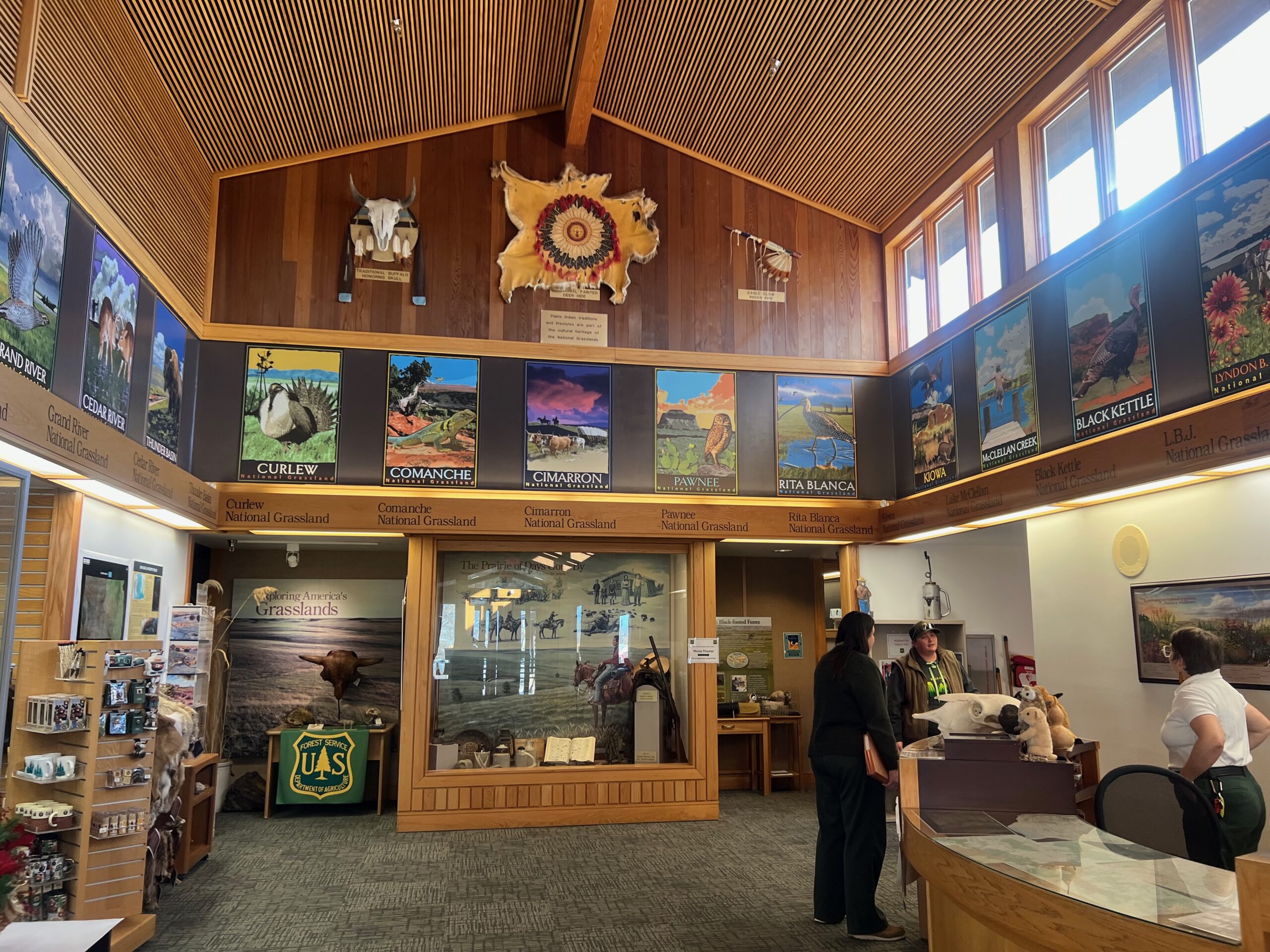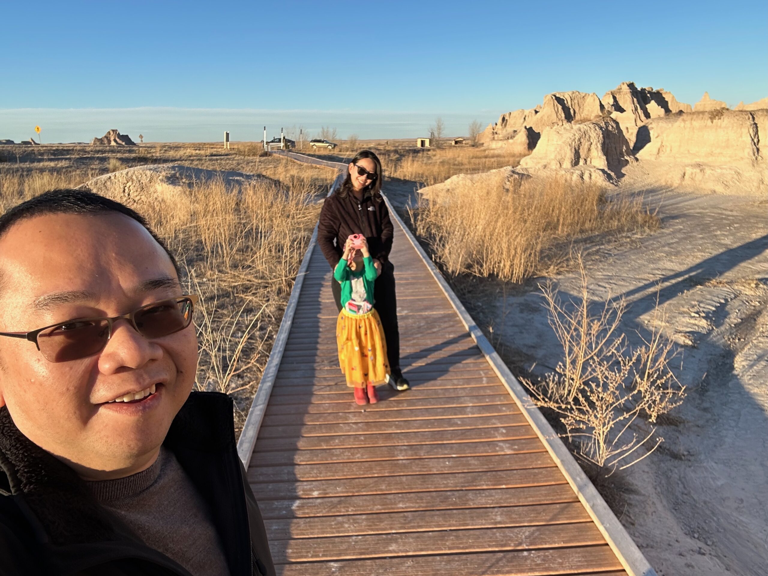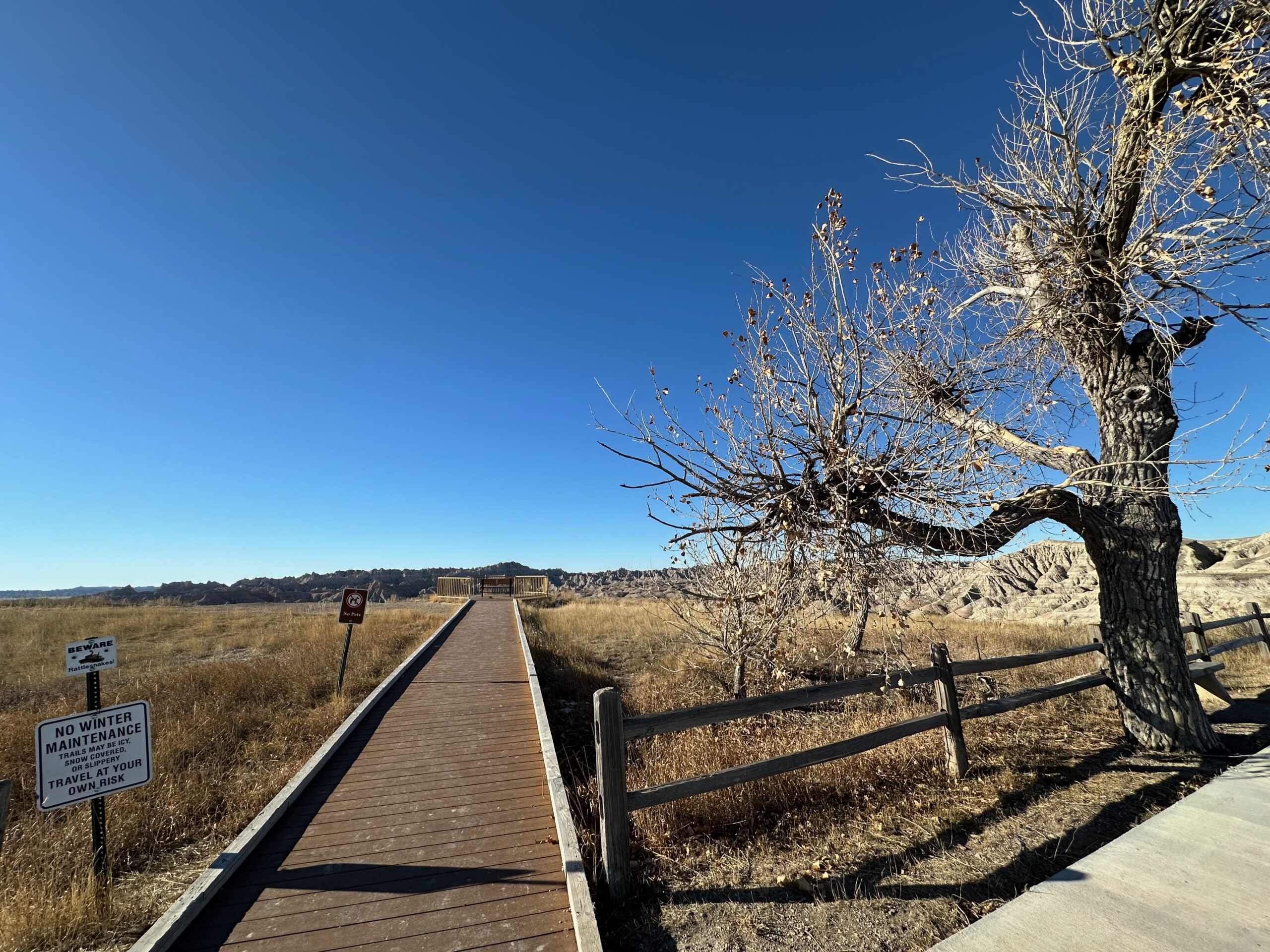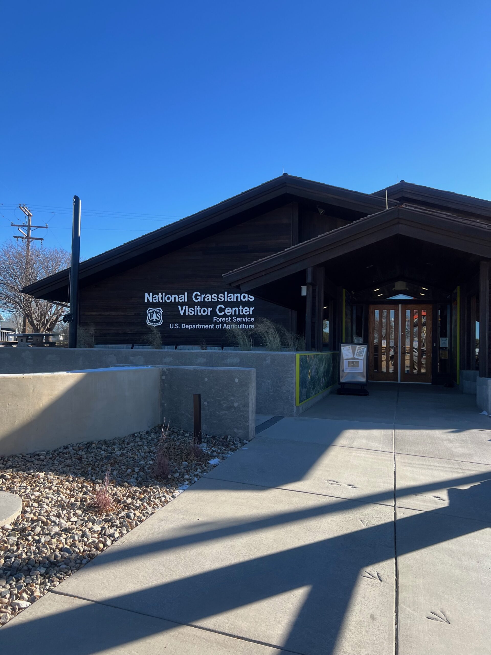 We began the day by checking out of our hotel, Hansen Inn & Cabins. If you’re ever in Wall, we highly recommend staying here. After checking out, we headed back to Wall Drug for breakfast, savoring the charming ambiance of this iconic spot once more. Our next stop was the National Grasslands Visitor Center, where we learned about the local flora and fauna. While inside the Visitor Center, I noticed a couple of guys hanging Christmas ornaments on the power lines outside. It was a quaint sight that highlighted how quiet and serene this town is in winter—they didn’t even need to block the road for their safety.