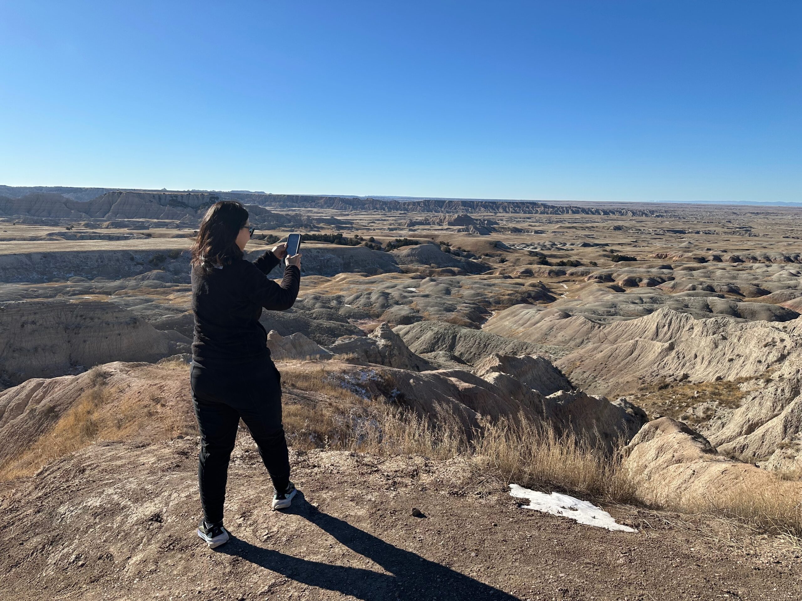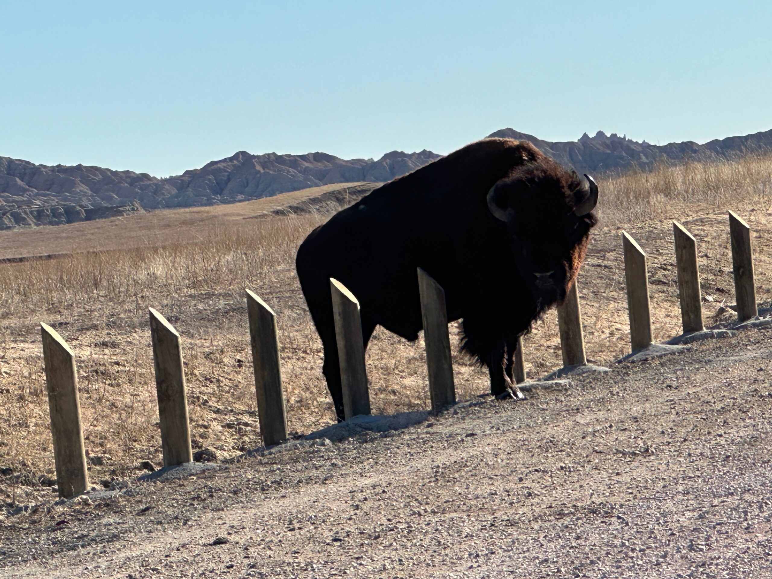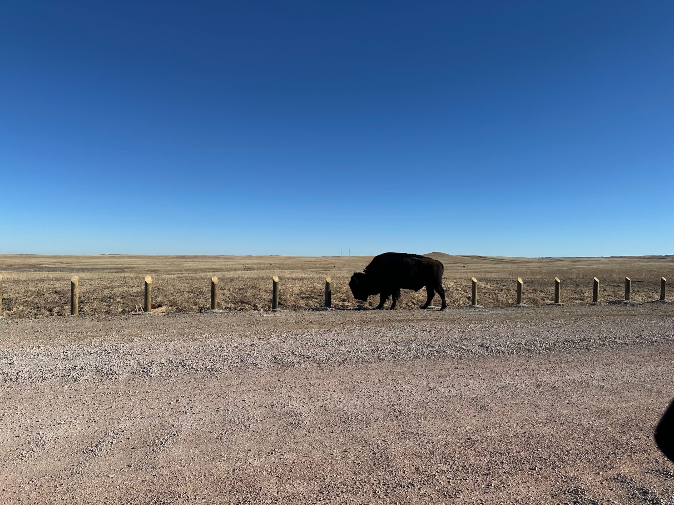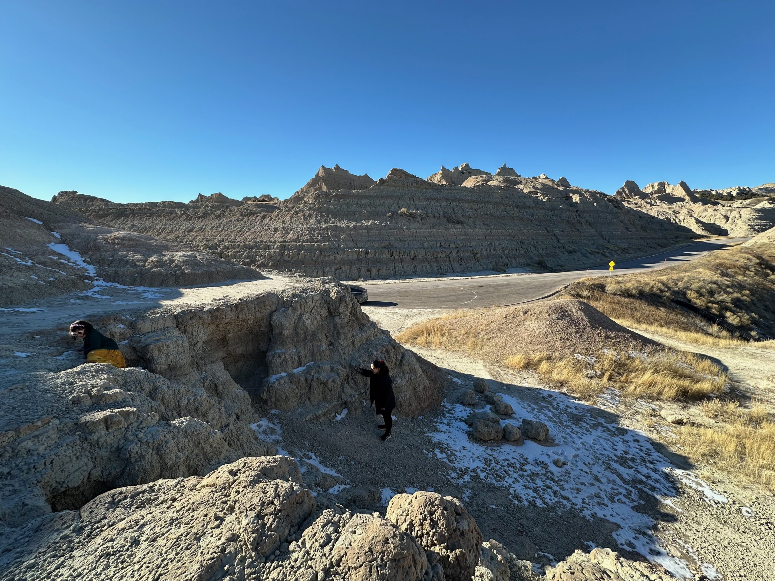 We then headed into the Badlands, opting to take the road directly south of Wall for our entry. This National Park is truly a marvel, with its striking landscapes and unique beauty. Visiting during winter meant that we almost had the park to ourselves, encountering only two or three other cars throughout the day. This solitude allowed us to stop wherever we wanted and get up close to the wildlife. One memorable encounter was with a bison, which was casually scratching itself on a road post before crossing the road right in front of us. We even had the chance to relax and have lunch at one of the overlooks, taking in the breathtaking views. It was truly an amazing experience and a fantastic start to our road trip.