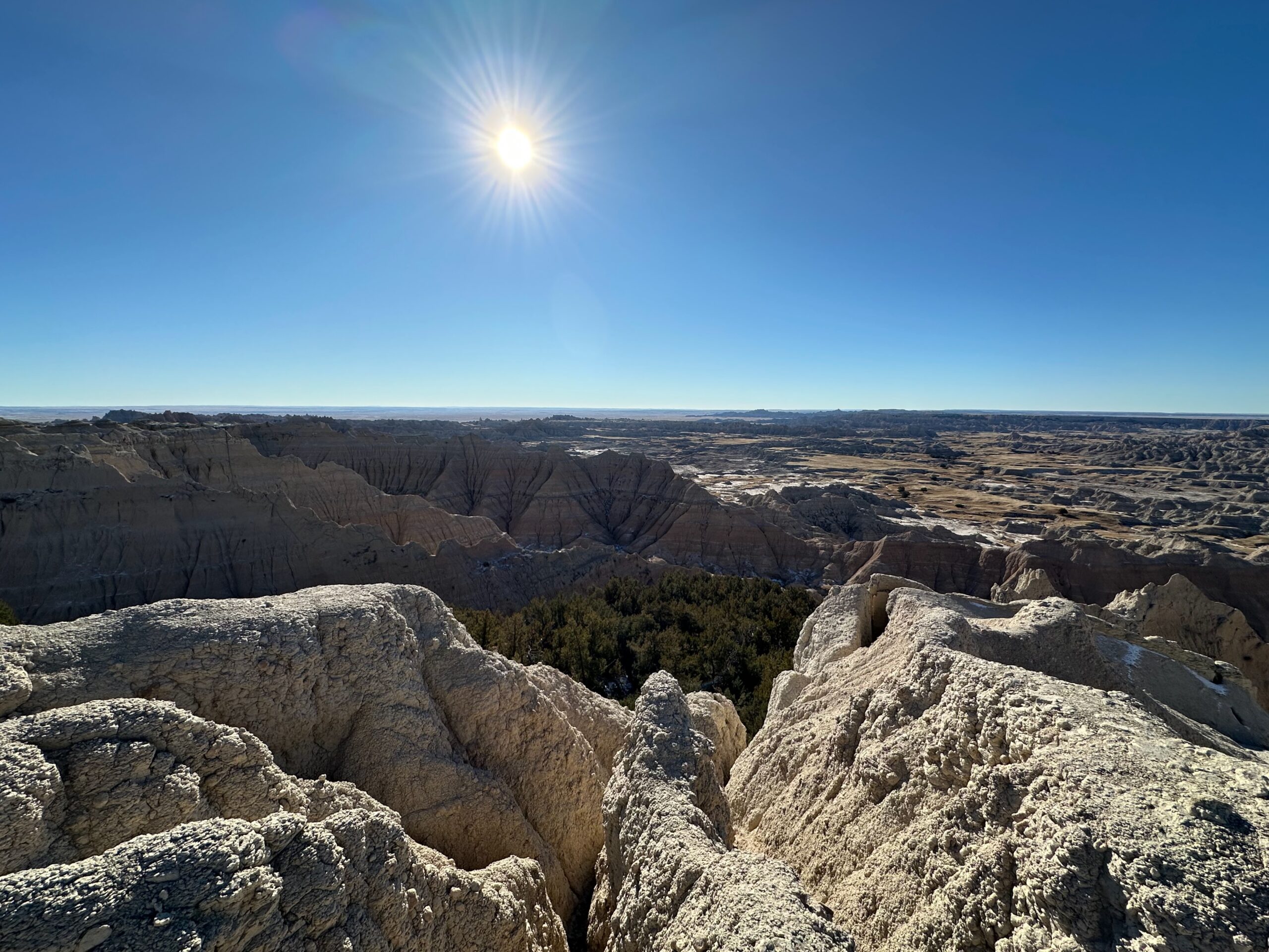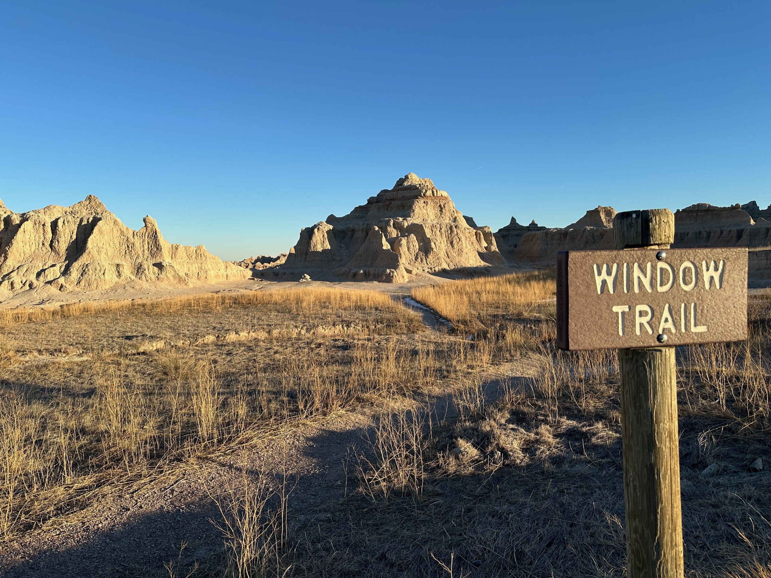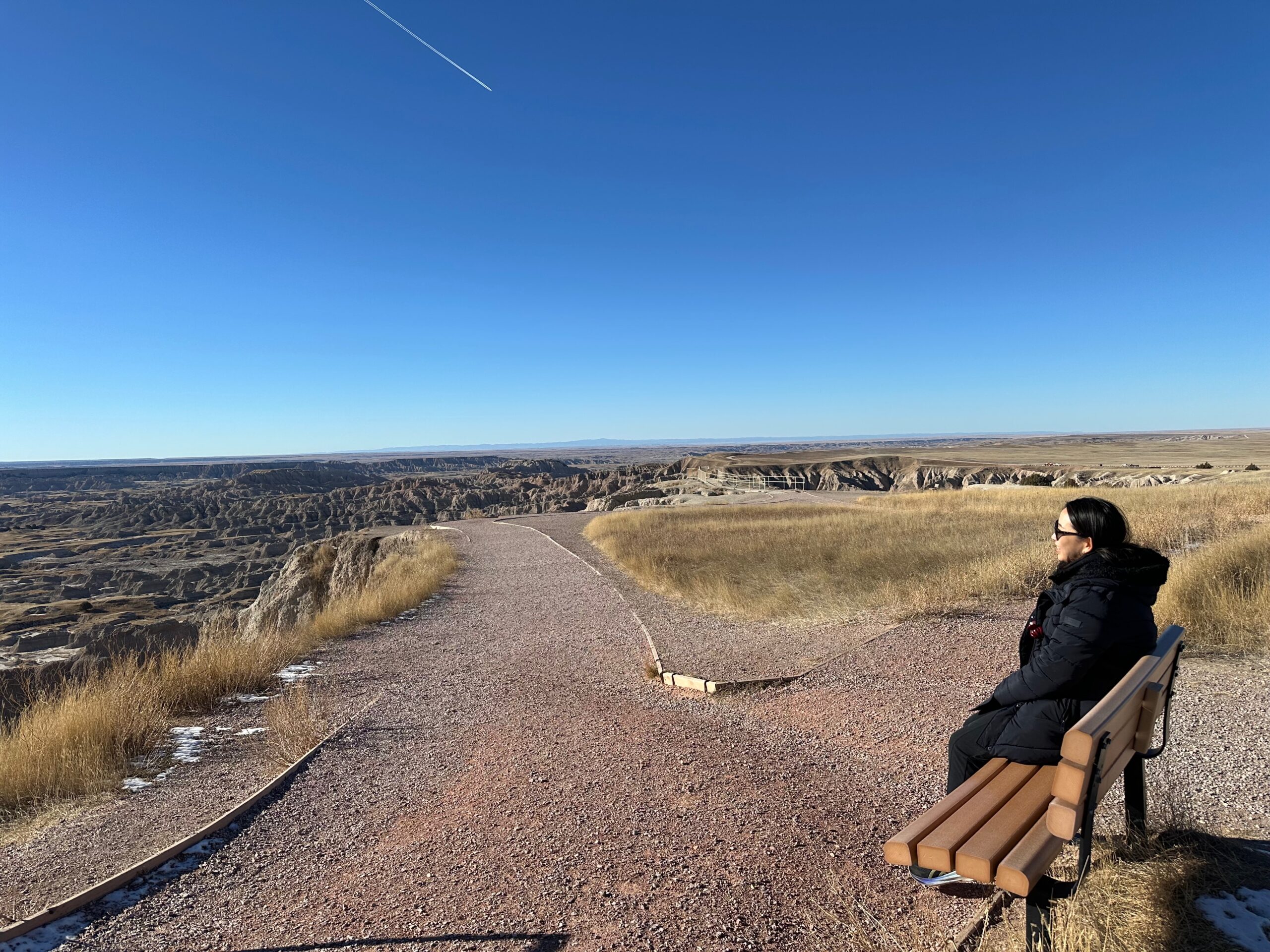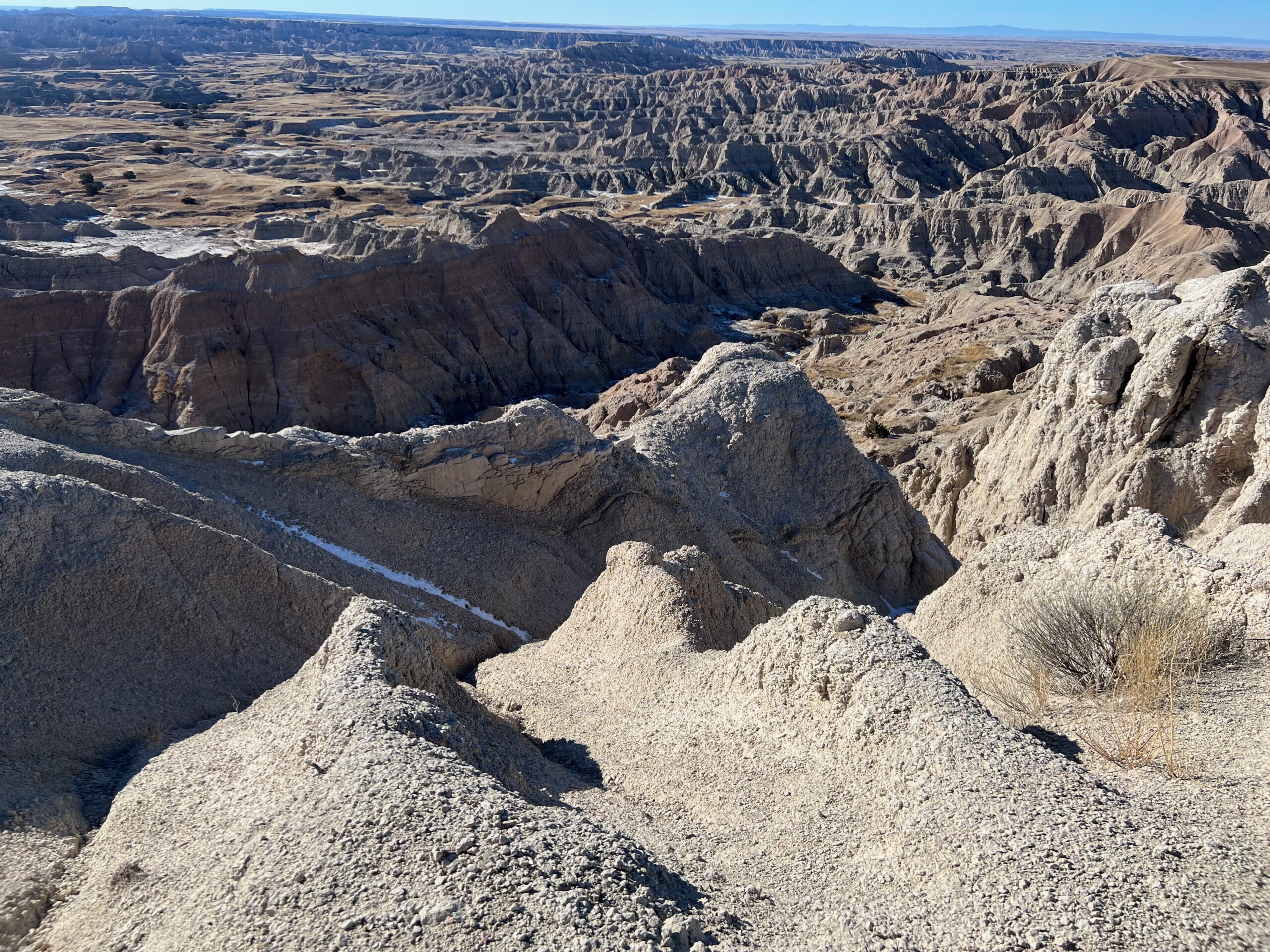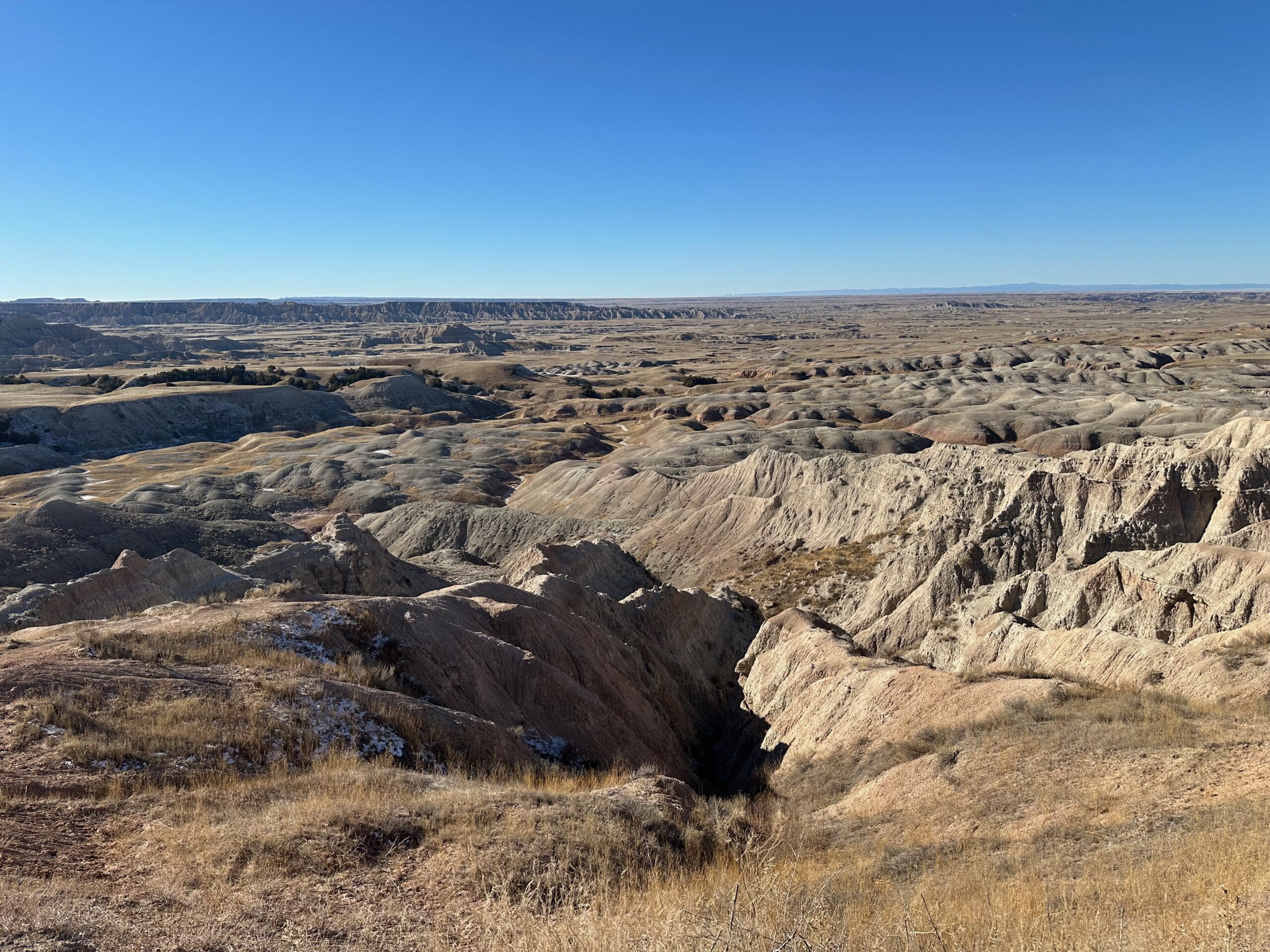 We then headed into the Badlands, opting to take the road directly south of Wall for our entry. This National Park is truly a marvel, with its striking landscapes and unique beauty. Visiting during winter meant that we almost had the park to ourselves, encountering only two or three other cars throughout the day. This solitude allowed us to stop wherever we wanted and get up close to the wildlife. One memorable encounter was with a bison, which was casually scratching itself on a road post before crossing the road right in front of us. We even had the chance to relax and have lunch at one of the overlooks, taking in the breathtaking views. It was truly an amazing experience and a fantastic start to our road trip.