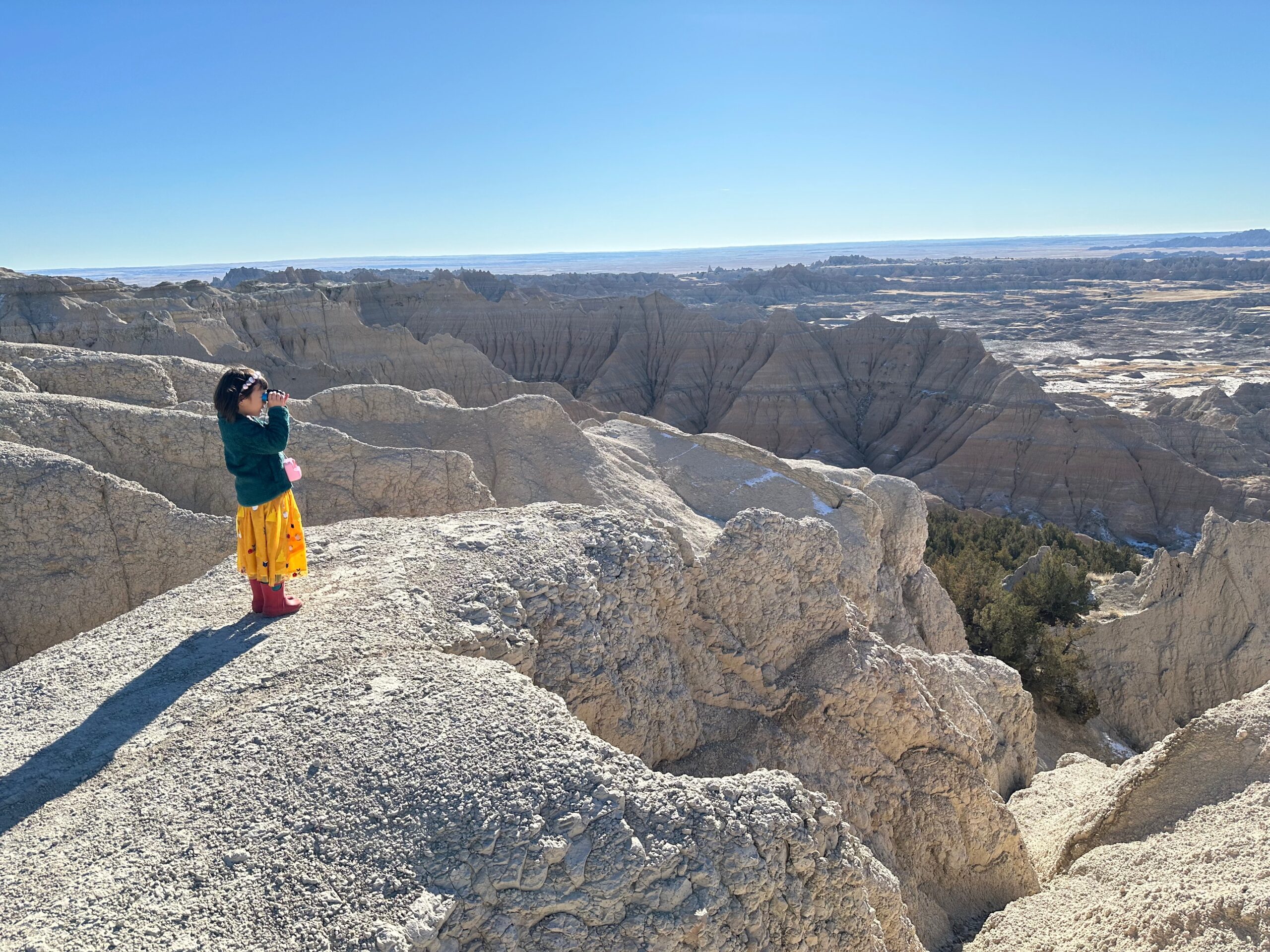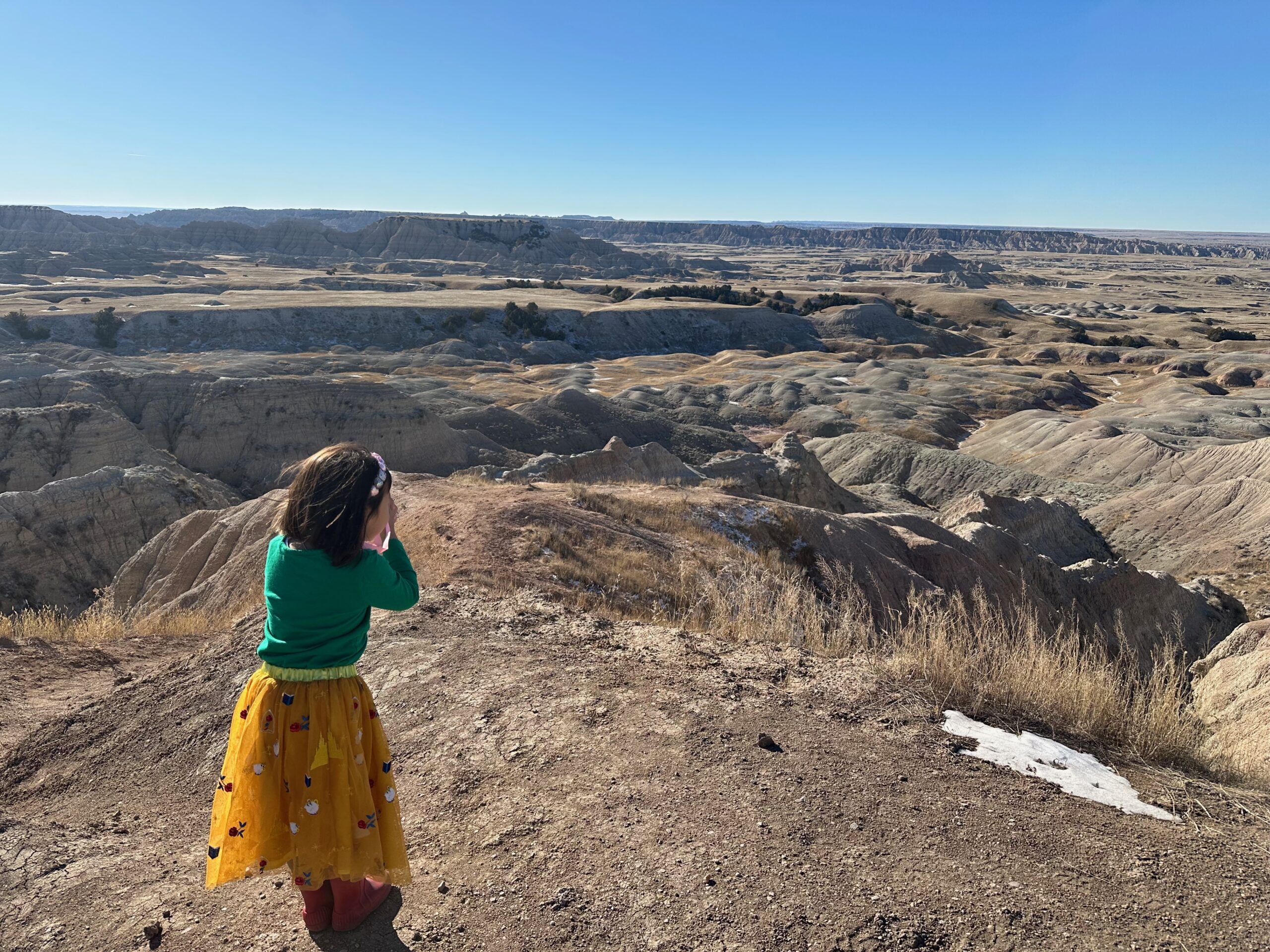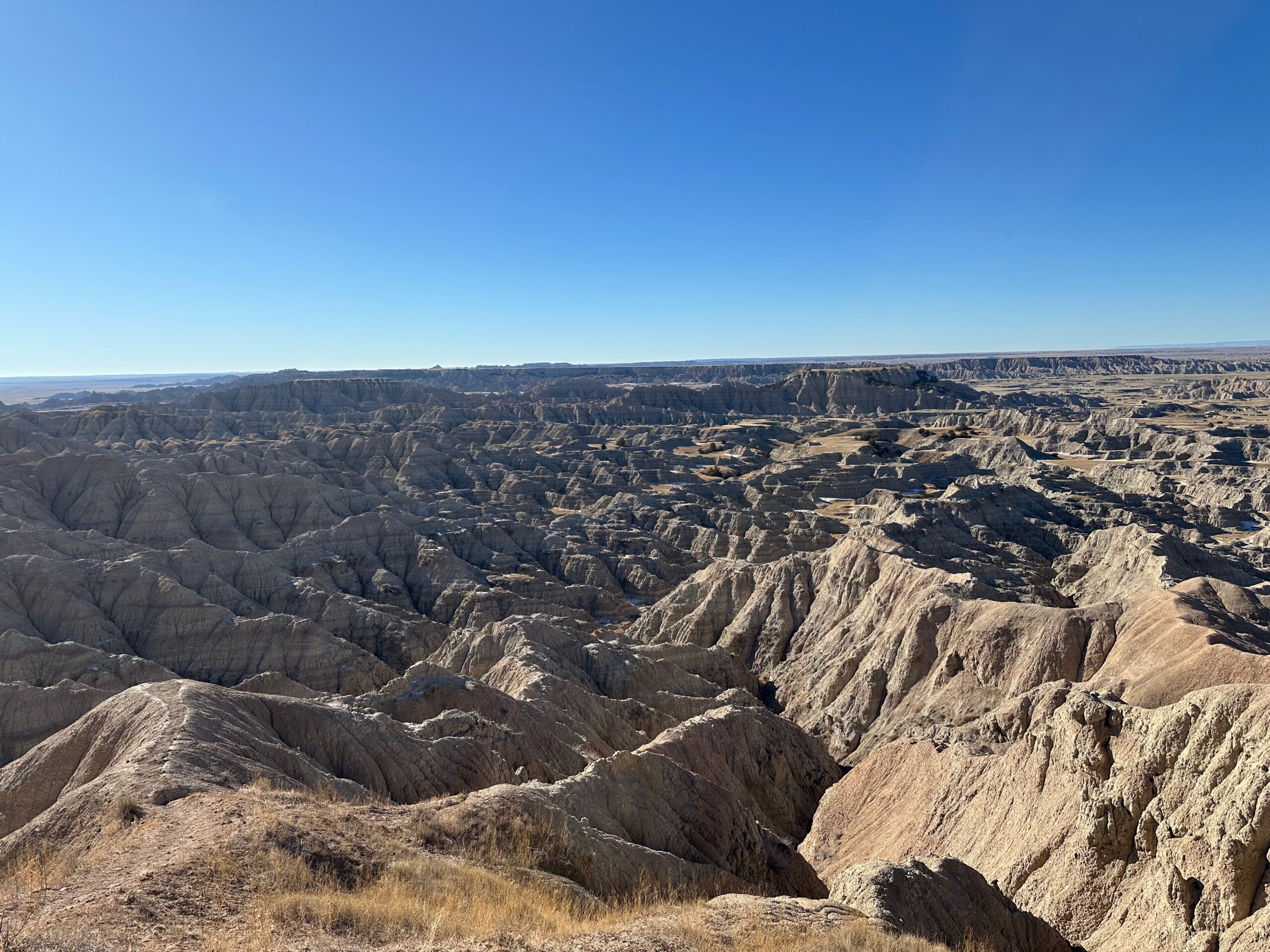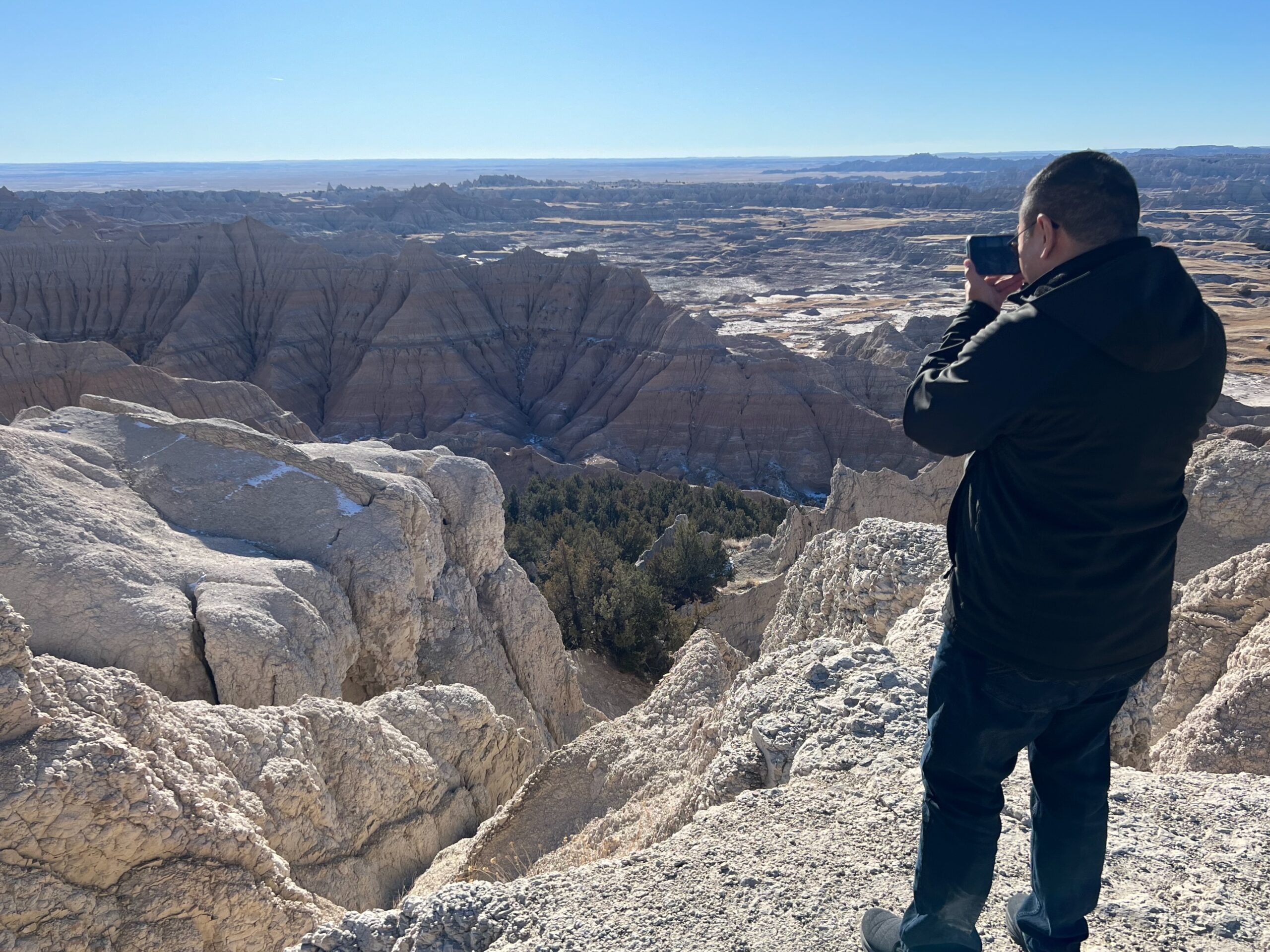 We then headed into the Badlands, opting to take the road directly south of Wall for our entry. This National Park is truly a marvel, with its striking landscapes and unique beauty. Visiting during winter meant that we almost had the park to ourselves, encountering only two or three other cars throughout the day. This solitude allowed us to stop wherever we wanted and get up close to the wildlife. One memorable encounter was with a bison, which was casually scratching itself on a road post before crossing the road right in front of us. We even had the chance to relax and have lunch at one of the overlooks, taking in the breathtaking views. It was truly an amazing experience and a fantastic start to our road trip.