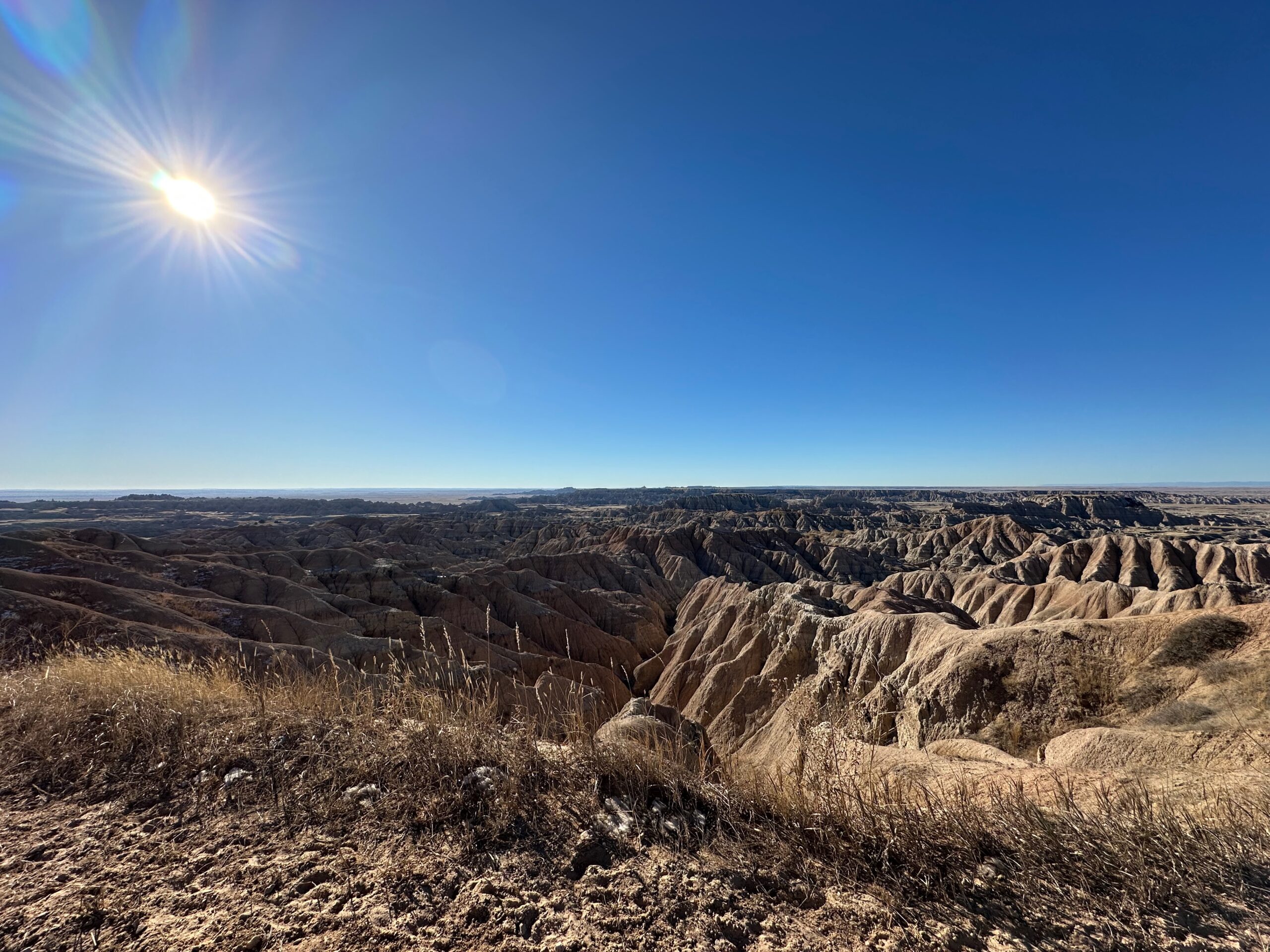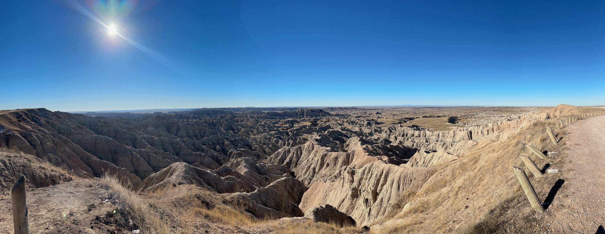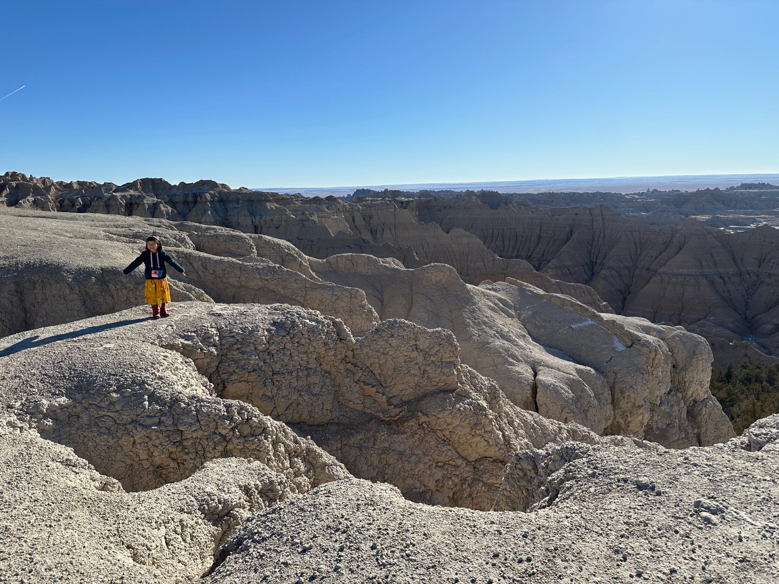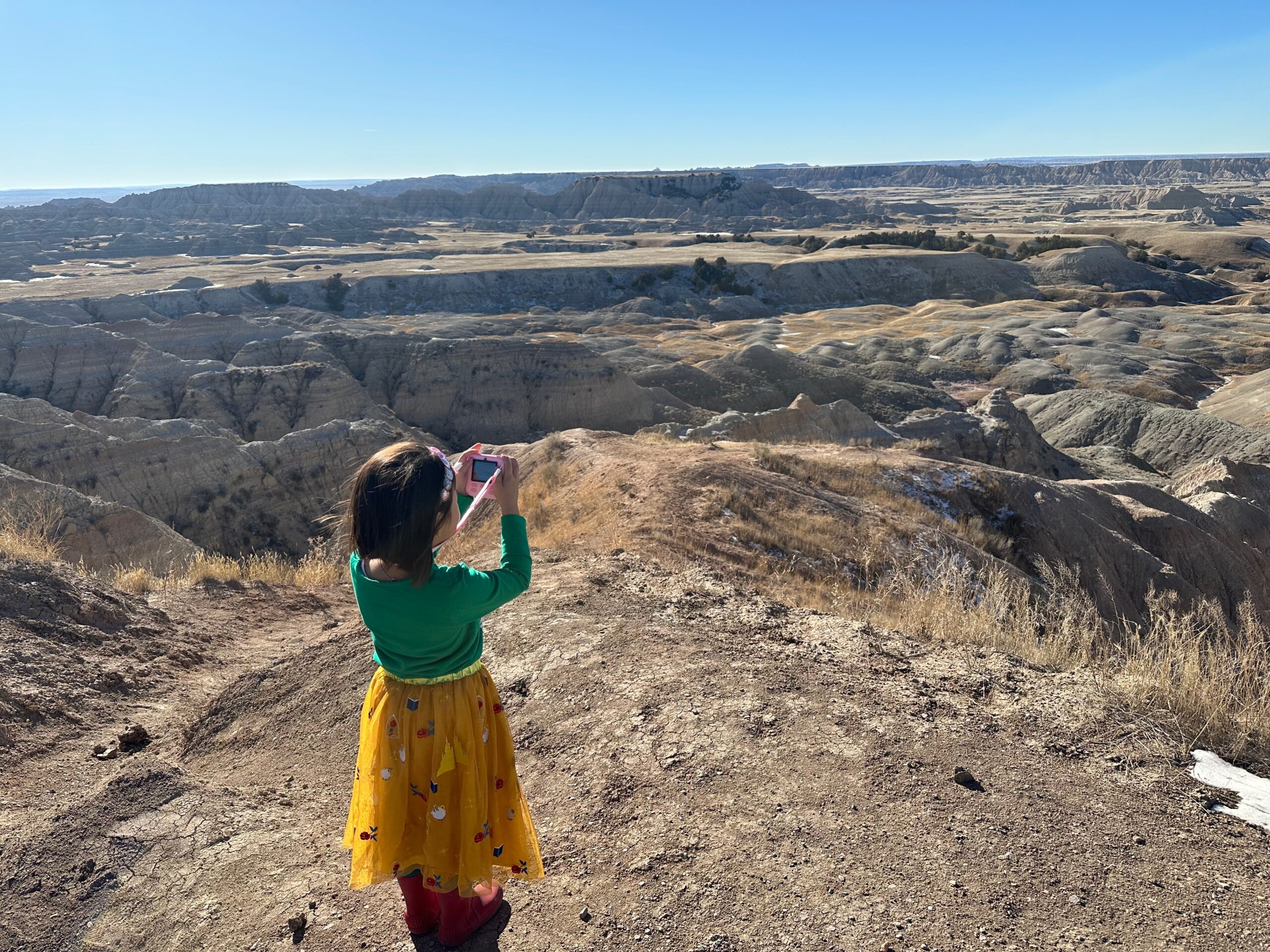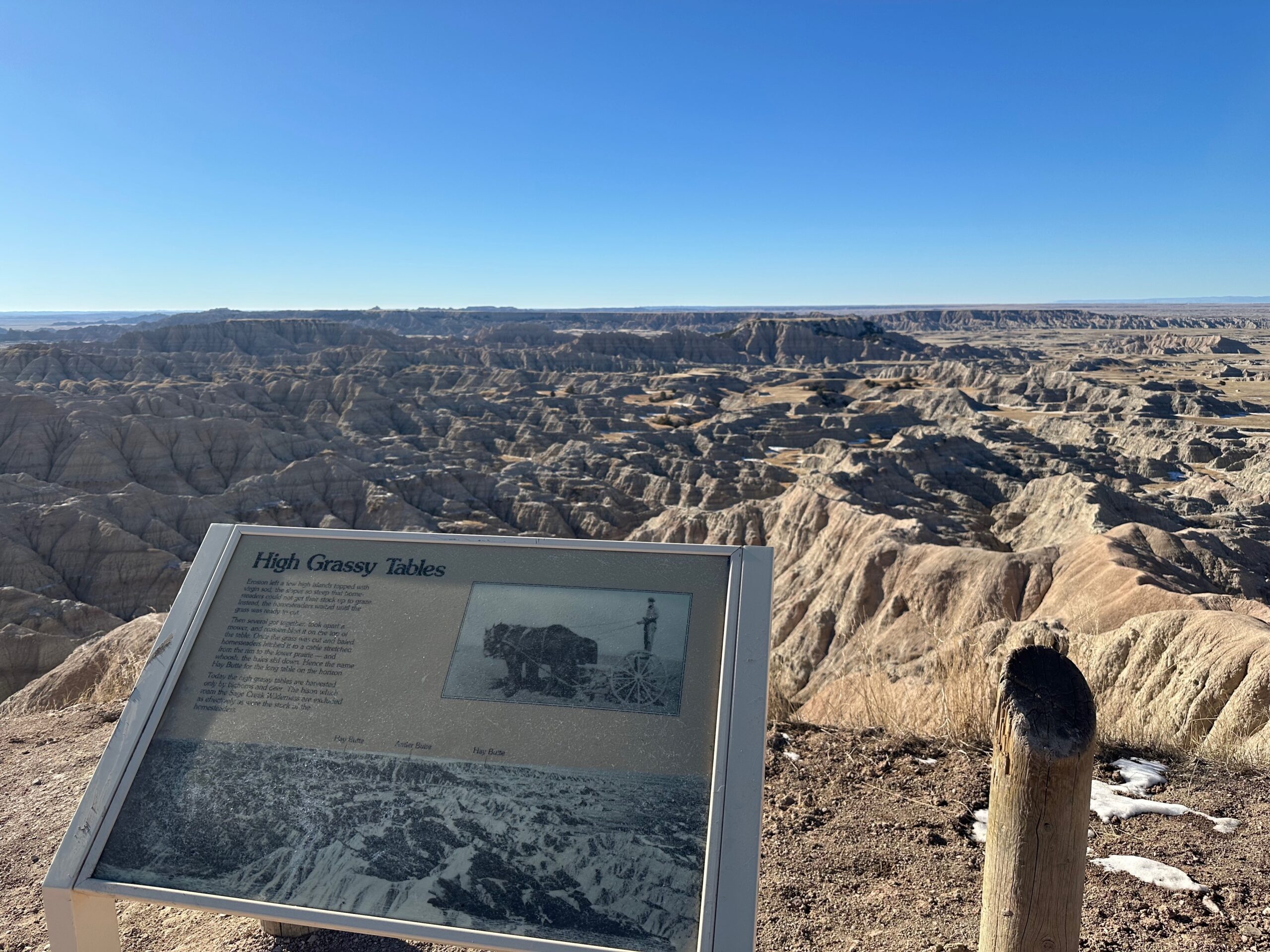 We then headed into the Badlands, opting to take the road directly south of Wall for our entry. This National Park is truly a marvel, with its striking landscapes and unique beauty. Visiting during winter meant that we almost had the park to ourselves, encountering only two or three other cars throughout the day. This solitude allowed us to stop wherever we wanted and get up close to the wildlife. One memorable encounter was with a bison, which was casually scratching itself on a road post before crossing the road right in front of us. We even had the chance to relax and have lunch at one of the overlooks, taking in the breathtaking views. It was truly an amazing experience and a fantastic start to our road trip.