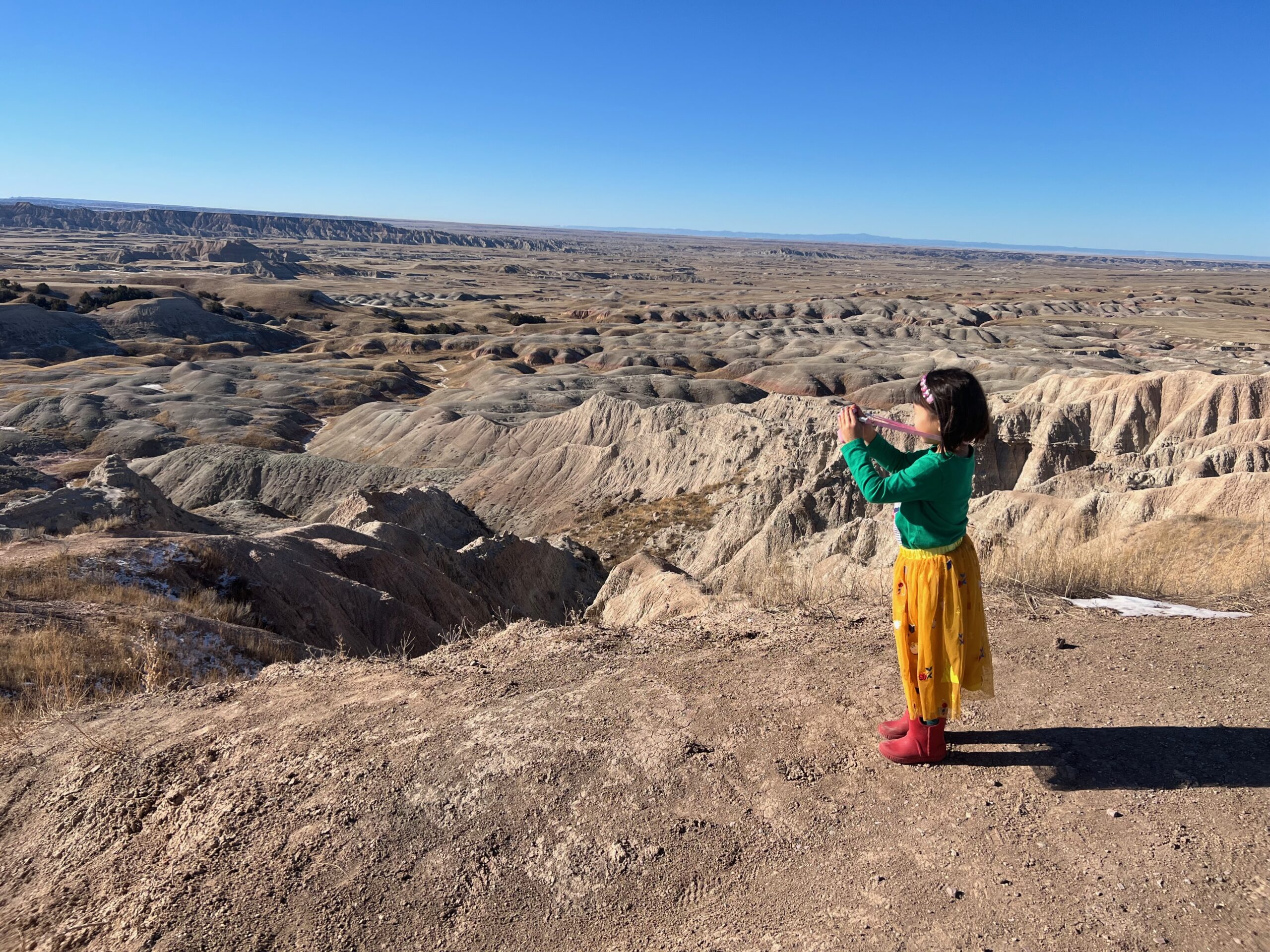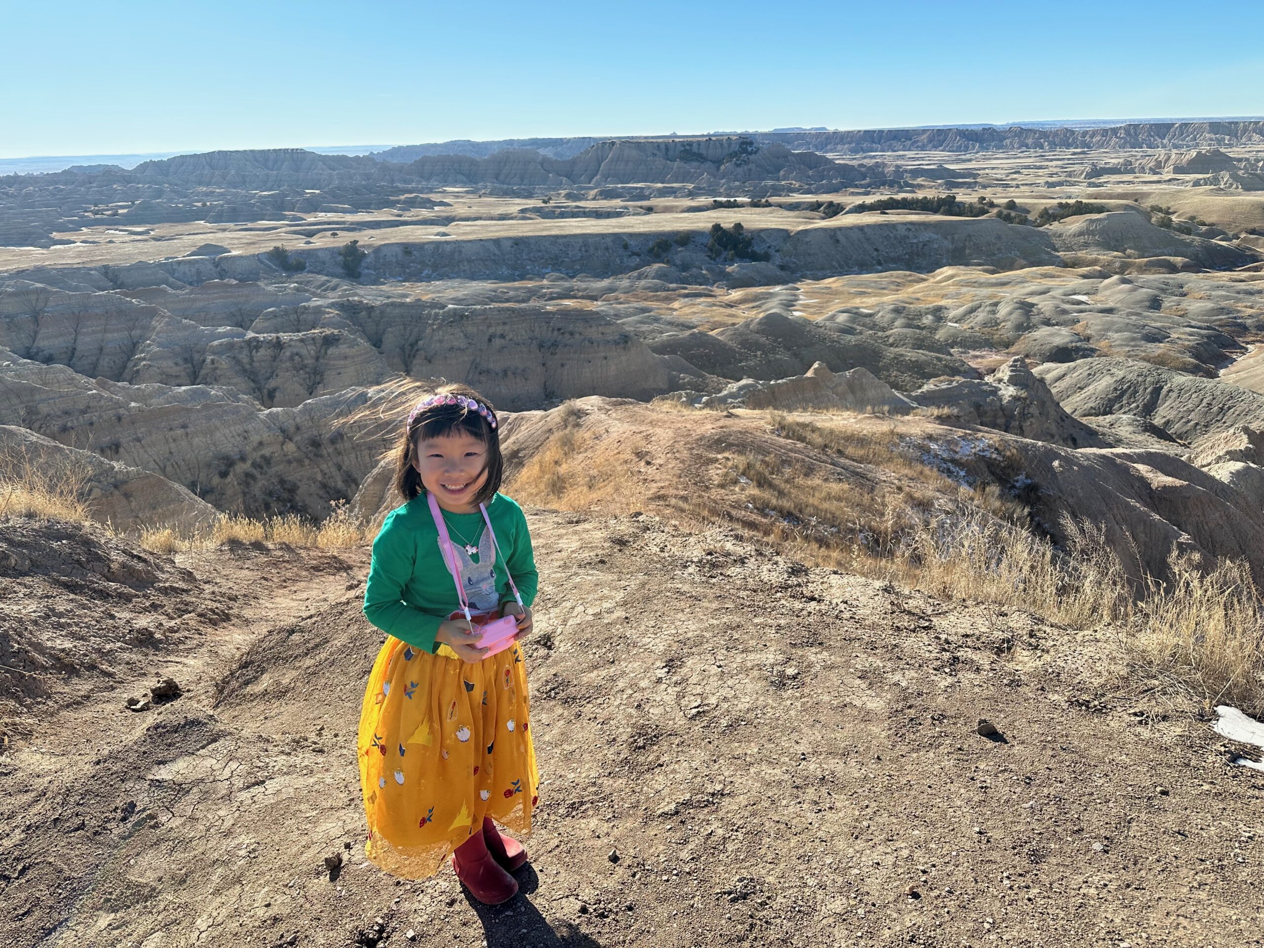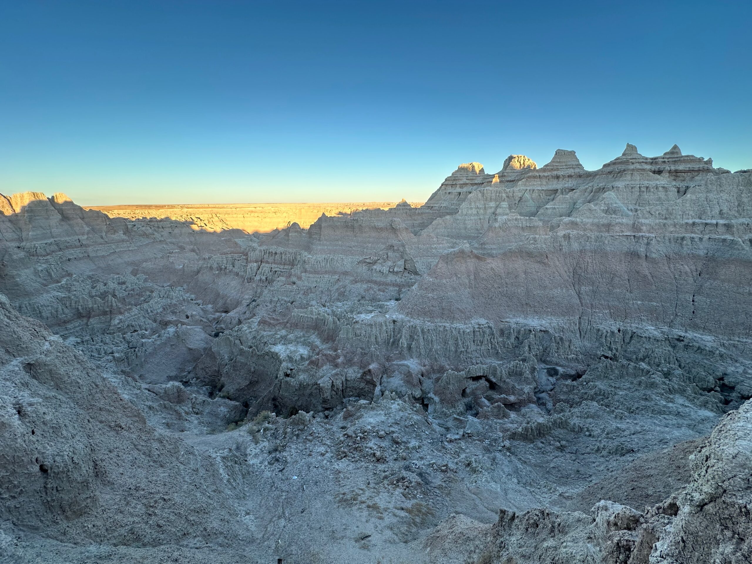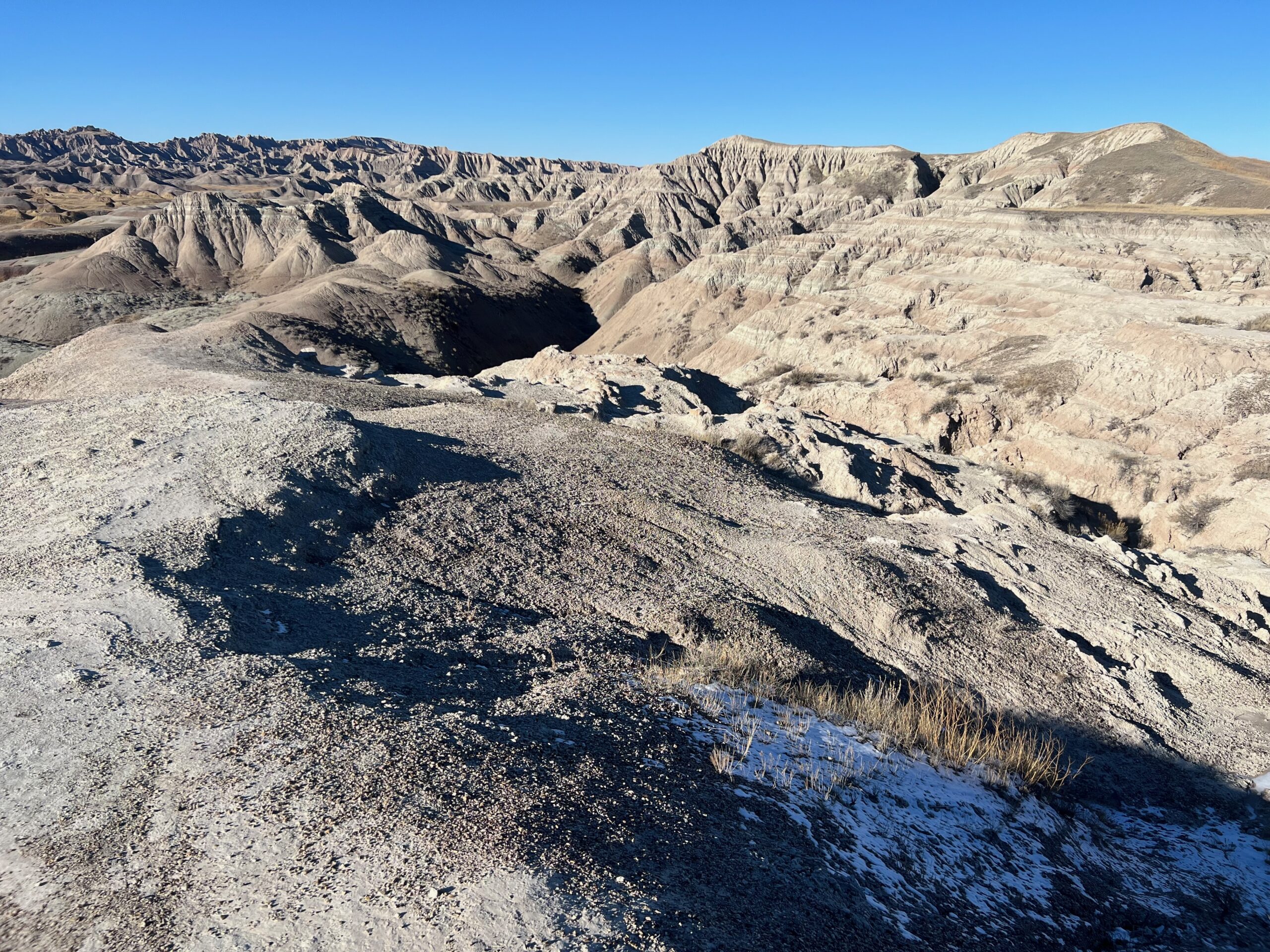We then headed into the Badlands, opting to take the road directly south of Wall for our entry. This National Park is truly a marvel, with its striking landscapes and unique beauty. Visiting during winter meant that we almost had the park to ourselves, encountering only two or three other cars throughout the day. This solitude allowed us to stop wherever we wanted and get up close to the wildlife. One memorable encounter was with a bison, which was casually scratching itself on a road post before crossing the road right in front of us. We even had the chance to relax and have lunch at one of the overlooks, taking in the breathtaking views. It was truly an amazing experience and a fantastic start to our road trip.